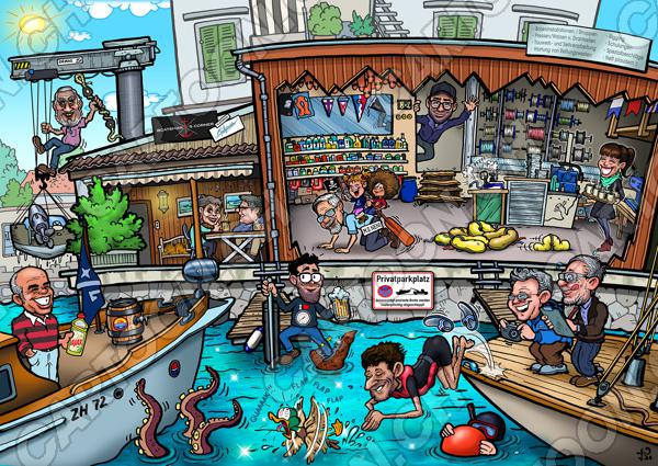 Tags: Wimmelbild Boot Schiff Ente Karikatur Geschenk Cartoon lustig farbig Figuren See bunt Comic Menschen Wasser Hafen Laden Geschäft Boje Weste Schwimmweste Motorboot Segelschiff Seil Seilwerk Kran