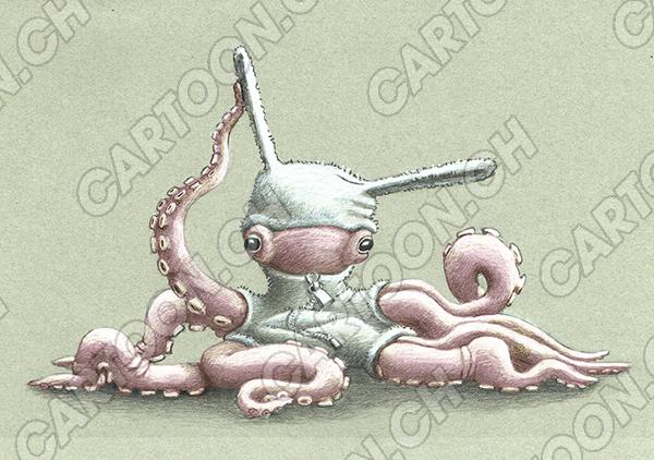 Tags: Zeichnung Kinderbuch Tiere Osterhase Meer Krake Bunny Verkleidung Casting Kopf Oktopus Tintenfisch Tiefsee Aquarium Augen Arme Multitasking Kopffüssler